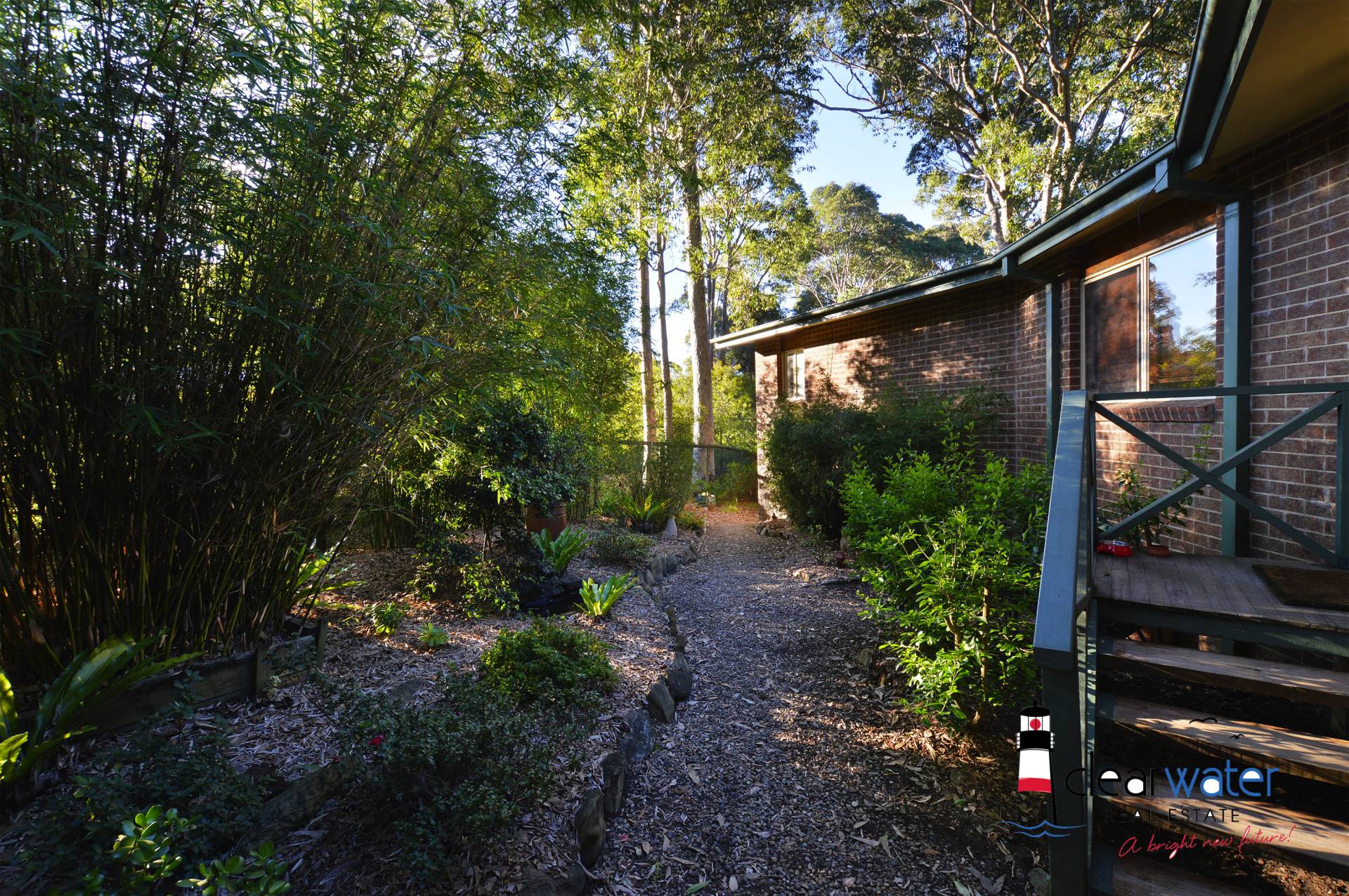 Outside: Paths meander through the low maintenance native landscaped gardens which are visited daily by many colourful birds. Block size is a generous 1295m2.