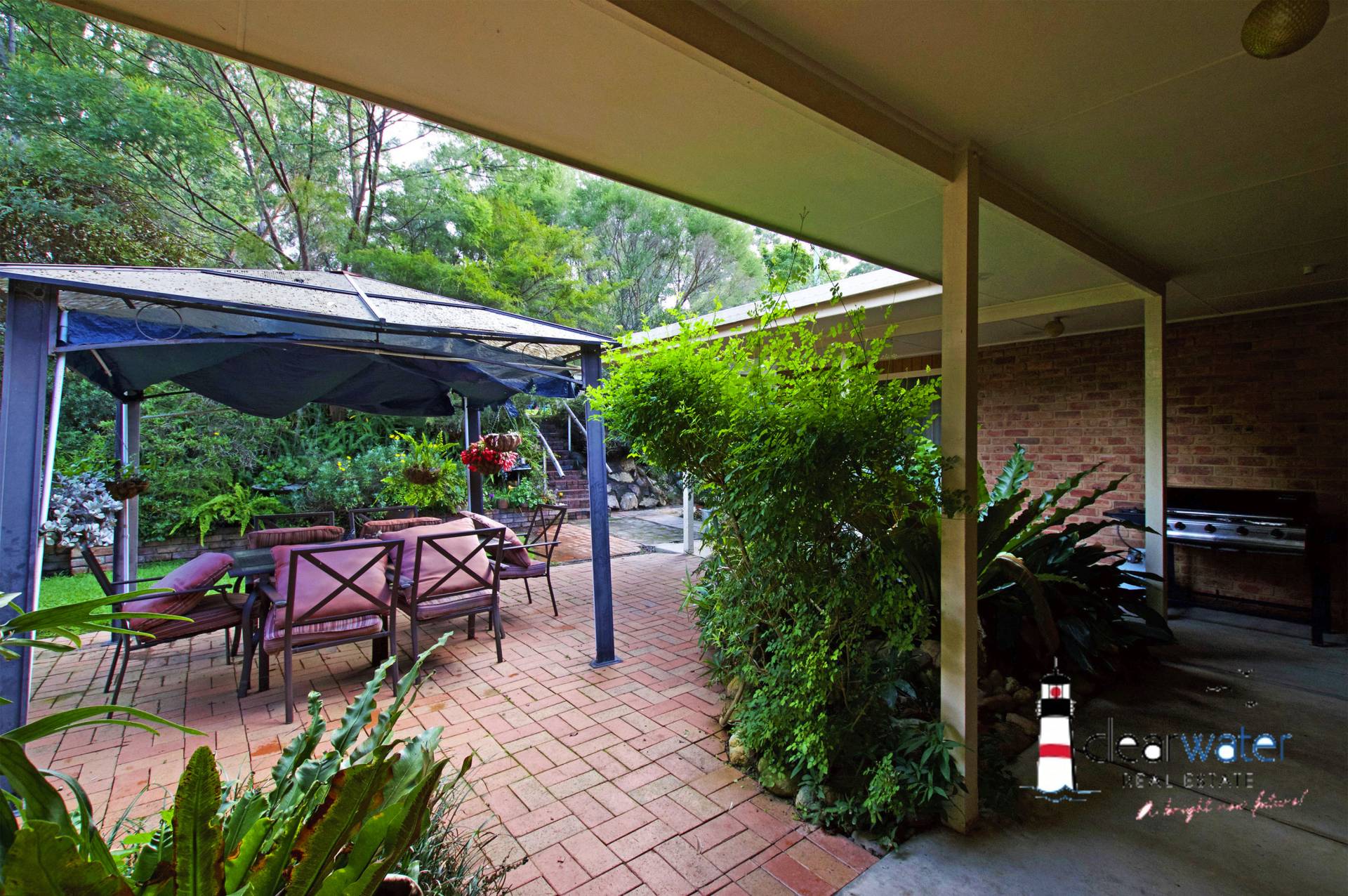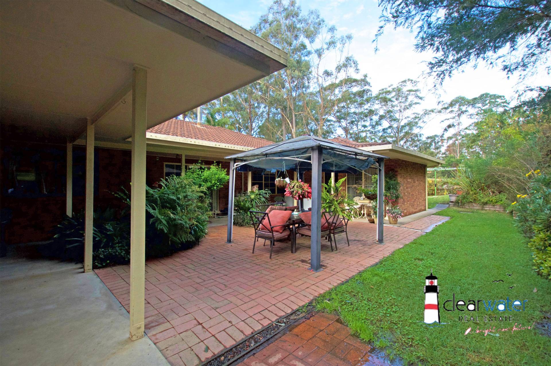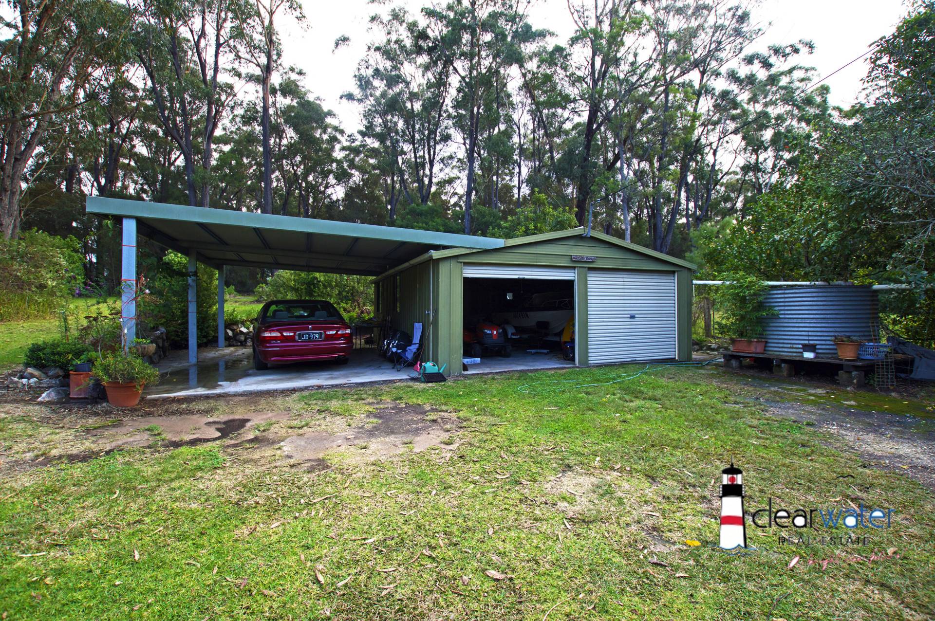 A double garage and single carport are detached from the house, and catch the rain water for the gardens and greenhouses.