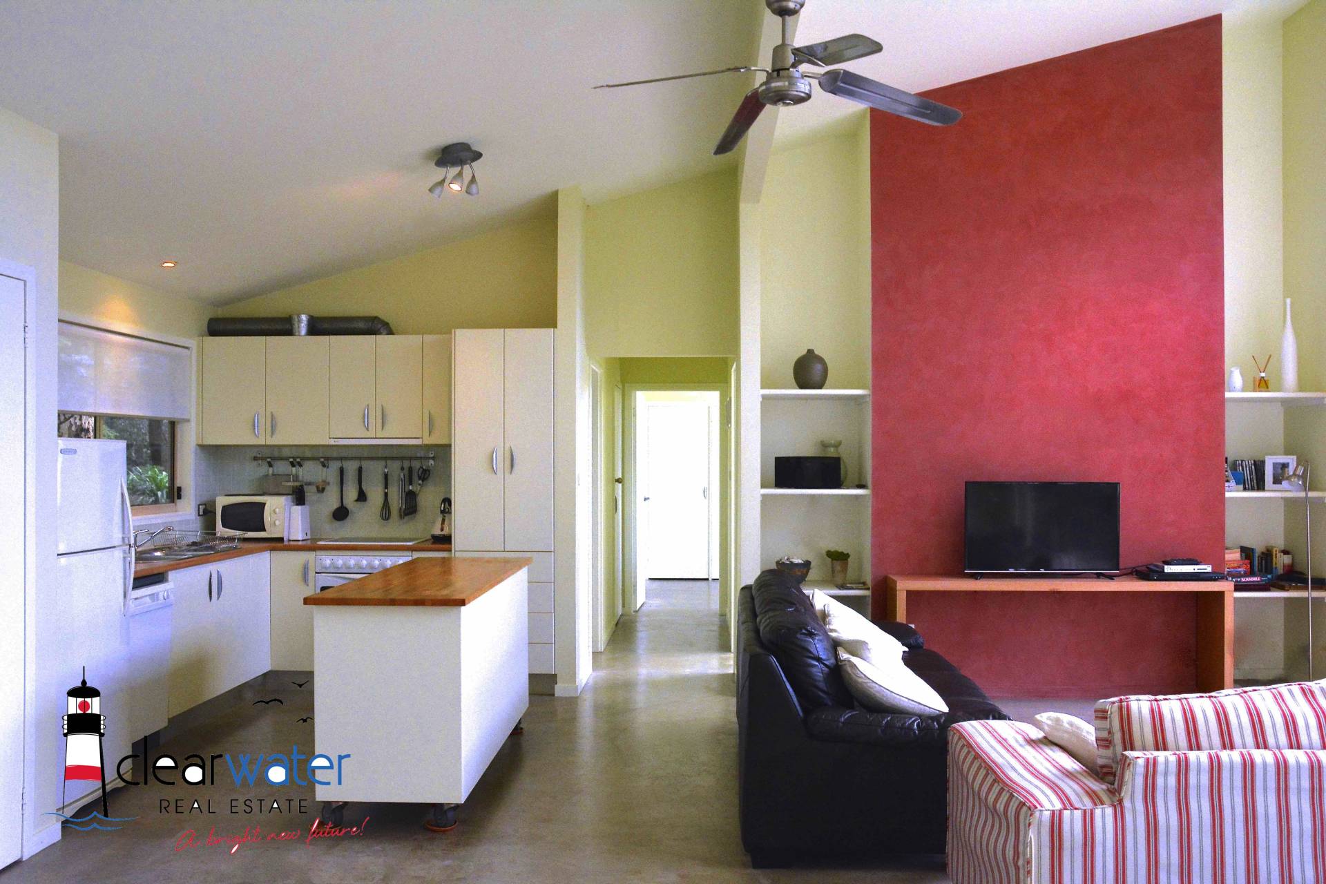 Second House: Currently used as the main Coastal Retreat accommodation, this versatile home can suit a larger group or two separate bookings. The main part of the home features a full sized kitchen, open plan lounge dining area, huge north facing glass windows which lead onto the patio, central bathroom and two good sized bedrooms. The second part of this home has its own separate entrance and can be closed off (or opened for a bigger group) and features an open plan studio style accommodation with a kitchenette, full sized bathroom and relaxing spa bath. A private sitting area is easily accessible through the large sliding glass doors.