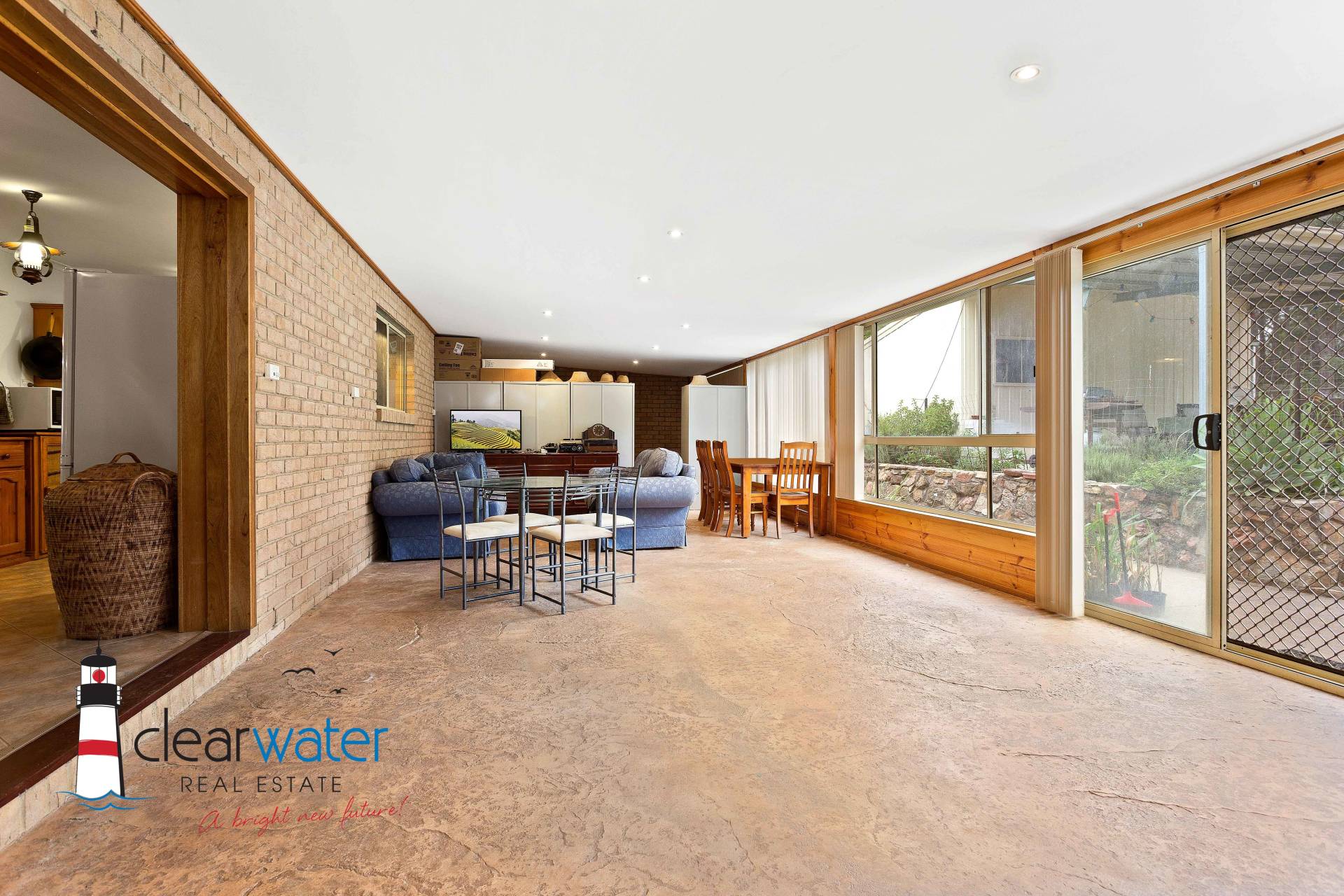 Features:  Open plan design with slow combustion wood heater, large master bedroom with ensuite, two additional good sized bedrooms, bathroom, rustic kitchen and a huge sunroom at the rear.  From the sunroom, you enter a fenced area which is ideal for family pets.  The covered alfresco barbecue area is up a couple of steps and next to a single garage.  The front yard is level with nice grass areas and minimal gardens.