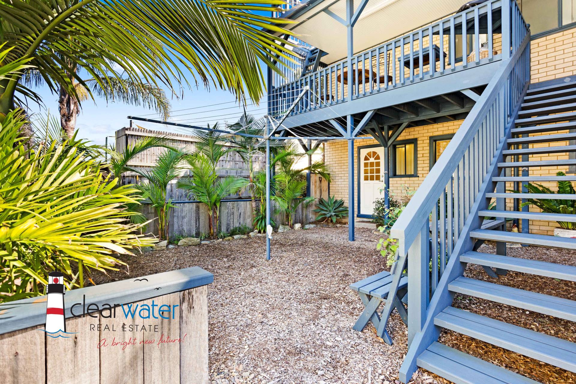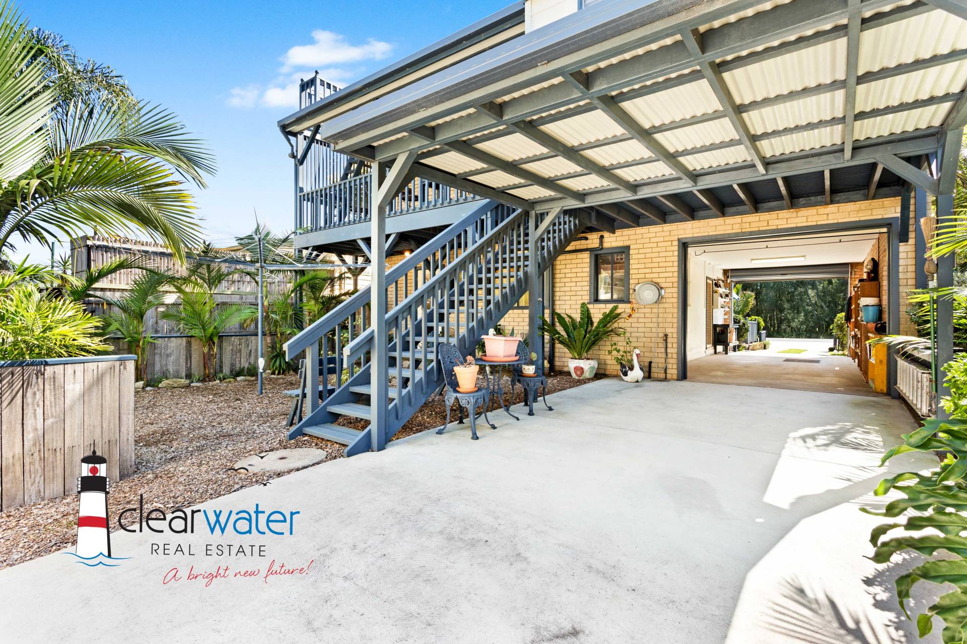 Upstairs: Two large bedrooms both with a BIR, parents retreat or spacious office that opens onto the rear entertaining deck. Open plan living that opens onto the front covered deck with a modern and functional kitchen with dishwasher, plenty of storage and bench space. There are glimpses of the beach from the deck, giving you the perfect place to sit and relax. The stunning central bathroom has a full-sized bath and large shower.