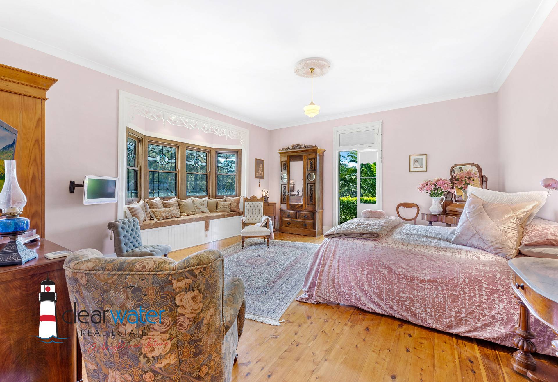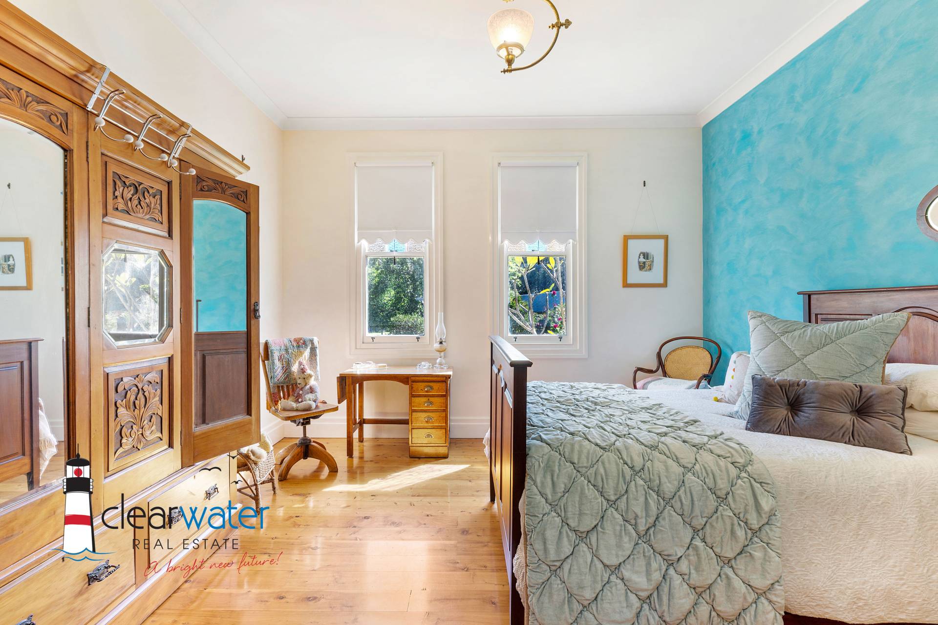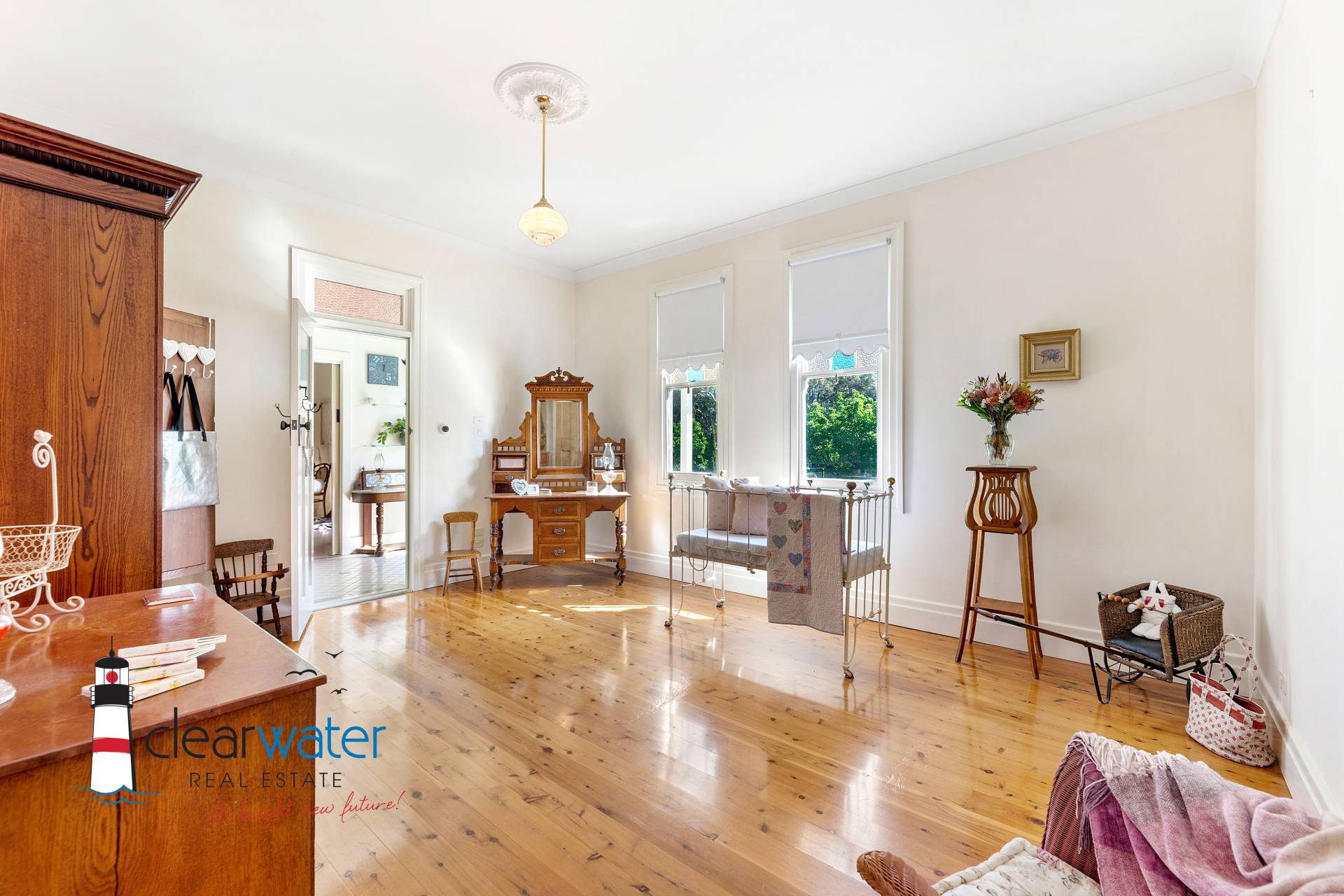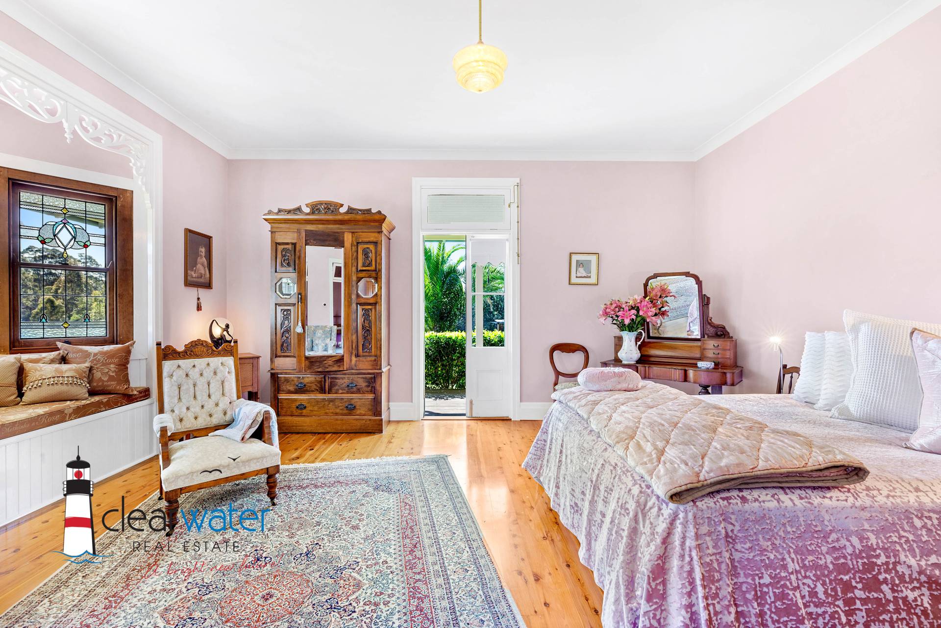 There is an ambience that oozes style and timeless energy throughout this stunning home. A generous master bedroom features a bay window seat, Antique wardrobes and French doors opening onto the front veranda to enjoy summer sea breezes.