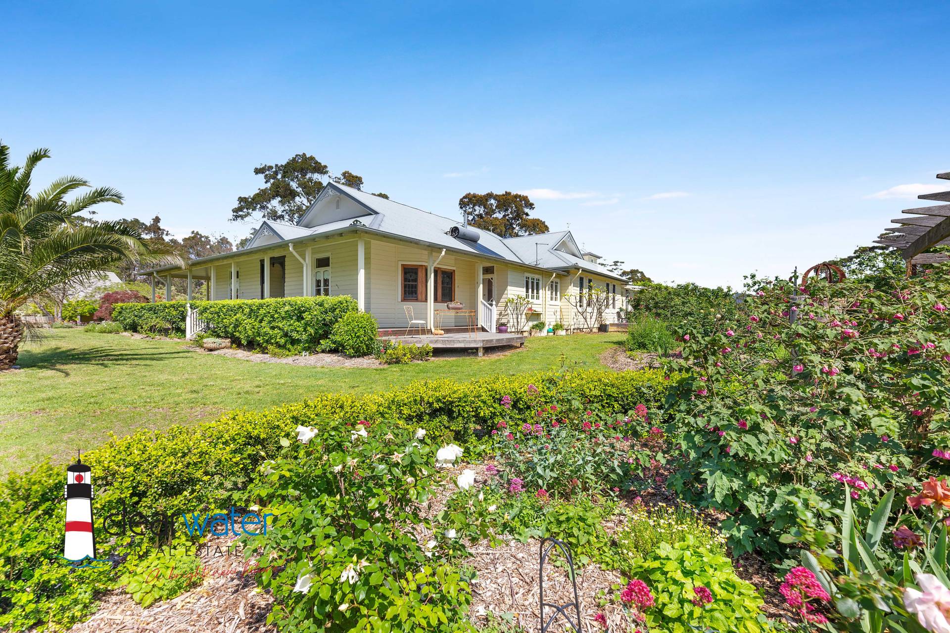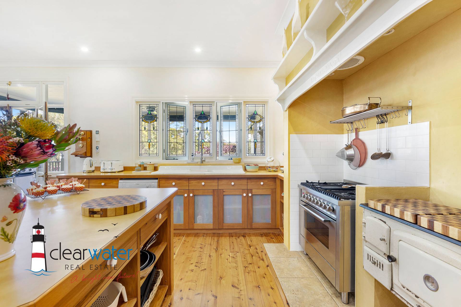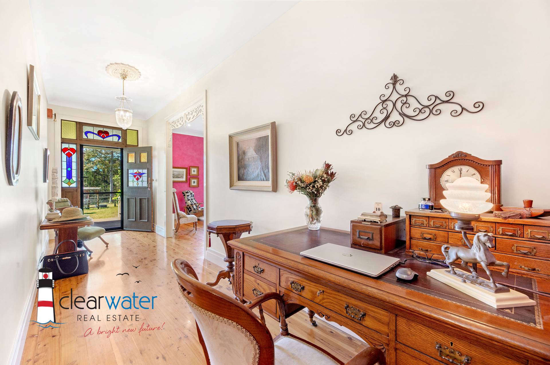 Other features include a second master bedroom with ensuite & French doors opening onto a private deck; main bathroom with claw-foot bath and antique washstand; guest WC; wide entrance and hallways; Chef’s kitchen with island bench & walk-in pantry; and, a home office space with fixed wireless NBN connected.